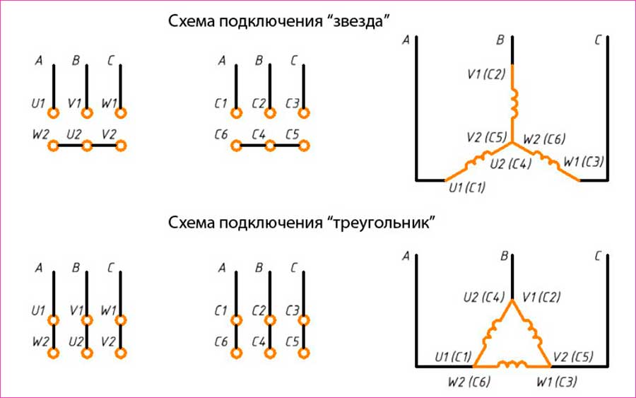 Подключение потребителей может быть выполнено в одном из двух вариантов — звездой и треугольником. В первом случае это 4 провода, из которых 3 являются фазными, а один — нулевым. Во втором применяют три провода