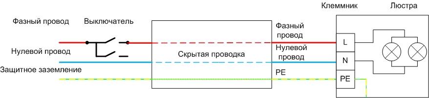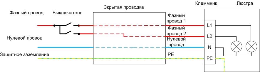 Схема этого варианта монтажа проводов приведена на самом верхнем рисунке. Количество лампочек в люстре показано условно, а их соединение выполняется только параллельным методом. Желто зеленым цветом показан проводник защитного нуля РЕ, голубым — рабочего N, а красным — фазы L.