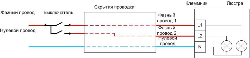Проводники N элементов многорожковой люстры соединяются между собой, фазные делятся на две связки, которыми можно управлять отдельно.