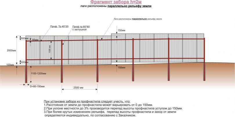 На уклоне меньше 35 градусов допускается делать пролеты забора шириной 2.5 метра. При неравномерном уклоне можно делать забор из пролетов разной длины. Увеличение уклона требует уменьшения длины секции. На неровных участках лучше устанавливать заборы на ленточном фундаменте.