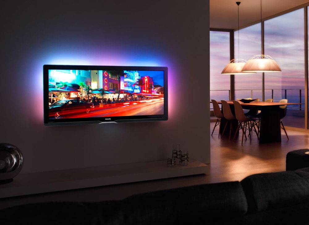 - После монтажа телевизора следует рассмотреть дополнительные принадлежности. Светодиодная подсветка – решение не только эстетическое, но и снижающее контраст, что позволяет сделать просмотр менее утомительным для глаз.