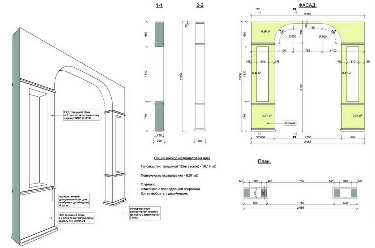 Из этого следует, что если арку делают там, где стояла стандартная межкомнатная дверь, то высоту проёма придётся увеличивать.