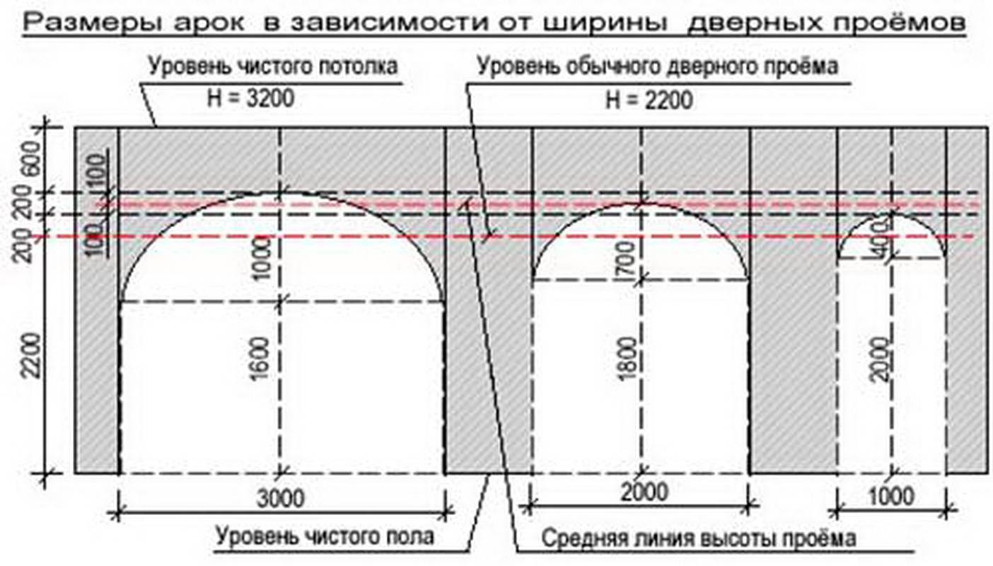 Но вначале надо определиться, достаточна ли будет высота свода. И если для ниши в стене размеры не играют особой роли, то для прохода между комнатами много значит соотношение ширины арки и расстояния от пола до точки сопряжения арки со стеной проёма.