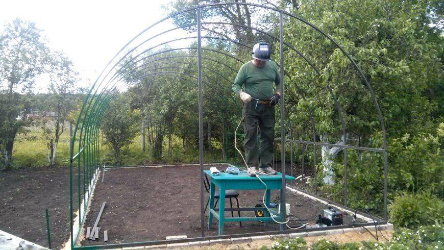 Самая простая схема, доступная для реализации – арочная конструкция. Для этого потребуется согнуть несколько труб одинакового размера и закрепить их таким образом, чтобы получились арки, стоящие одна за другой на равном расстоянии. Для большей прочности, вверху и по бокам крепятся дополнительные ребра жесткости.