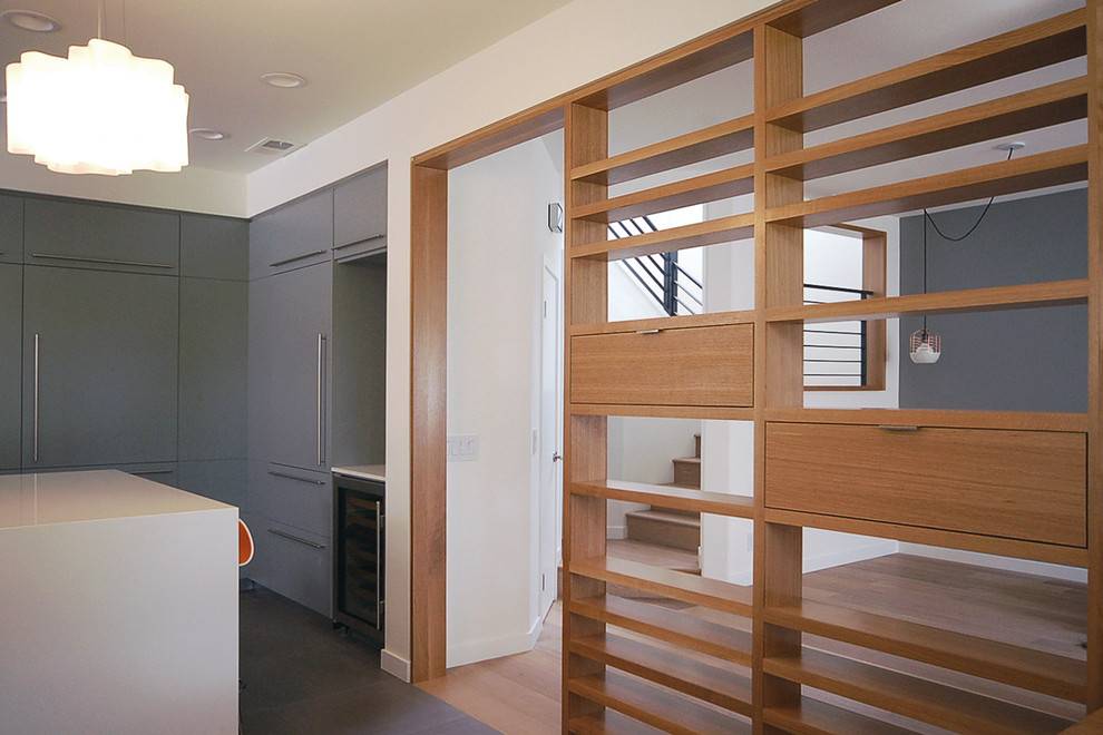 Еще один вариант разделяющей перегородки для кухонной зоны в общем помещении – надстройка стеллажа над полуостровом или барной стойкой. Практичный с точки зрения своего основного предназначения кухонный полуостров становится частью перегородки. Обычно добавление в виде стеллажа сводится к возведению лаконичных открытых полок над столешницей.