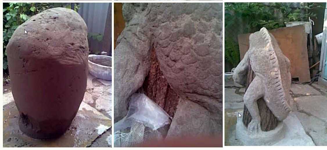 Берете нож, проволоку, шпатели, начинаете понемногу срезать лишнее. Боятся не нужно, если что-то лишнее уберете, можно позже добавить немножко раствора, подправить когда он подсохнет. В общем, технология не слишком сложная, но если нет художественных способностей, самому придумать что-то внятное сложно. Для таких случаев есть одна хитрость: находите фигурку небольшого размера из любого материала, глядя на нее ваяете свою.