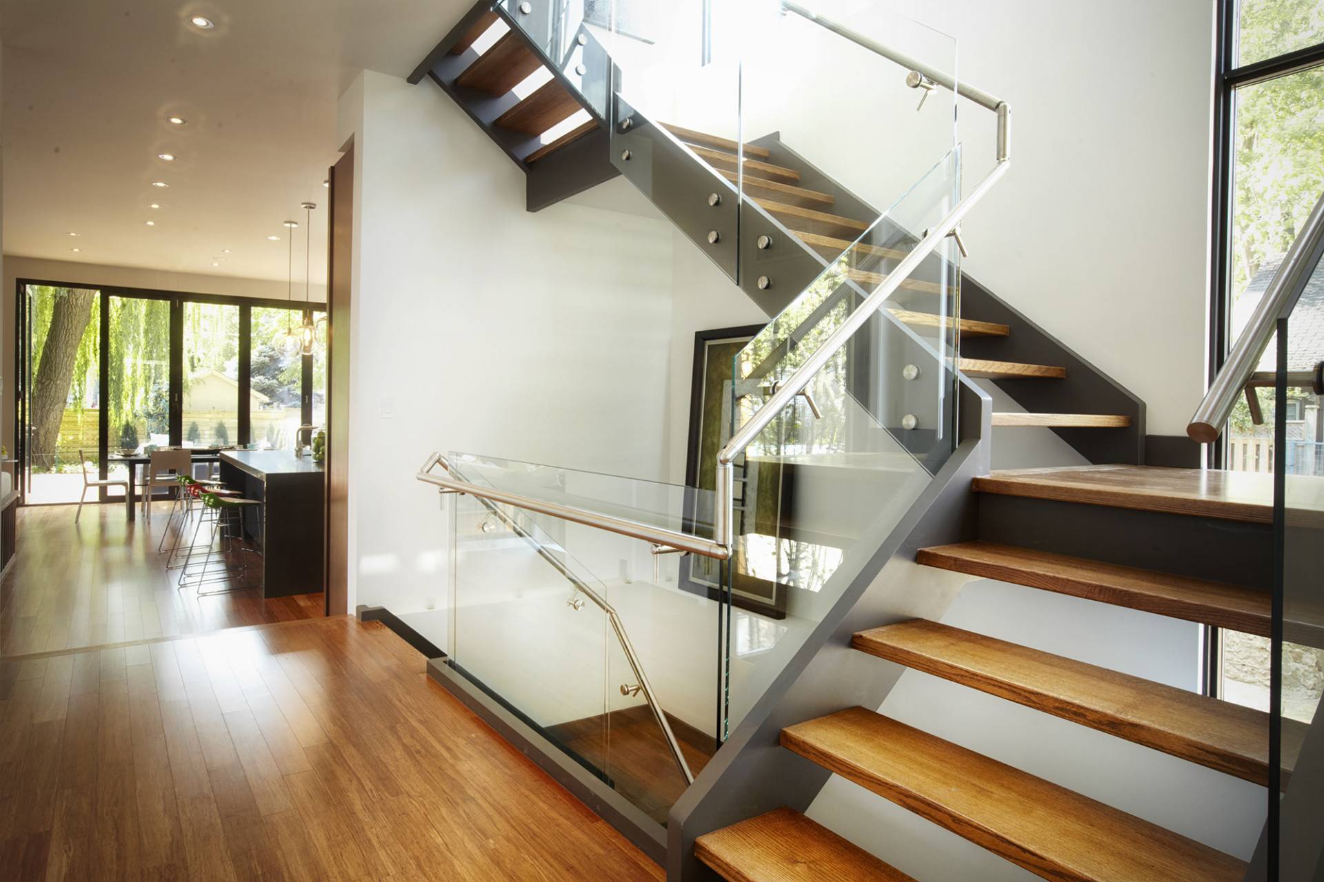 В некоторых стилях интерьера, таких как хай-тек и минимализм, характерно использование стекла как основного материала для лестничных ограждений. Такие элементы визуально выглядят как вставки, одновременно выступая прозрачной ширмой и выполняя функцию опоры, на которой держатся поручни.