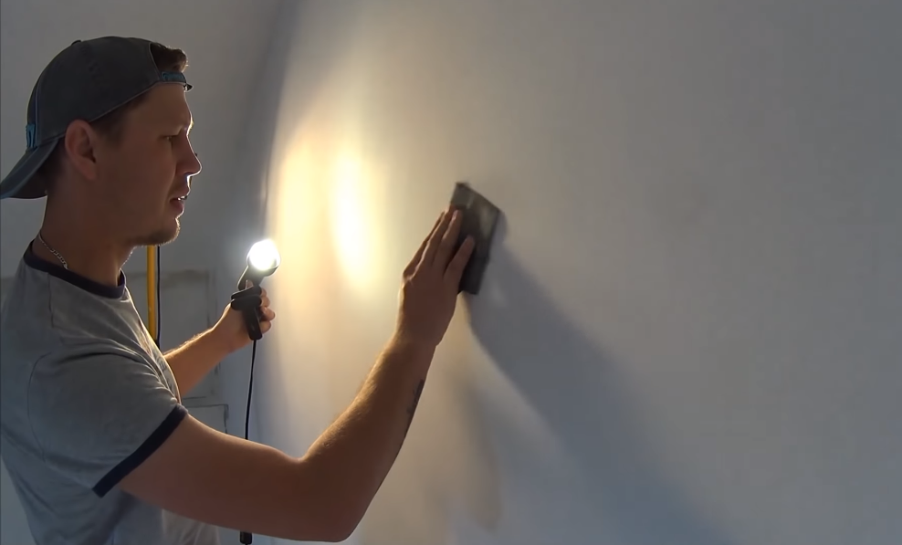 - При необходимости проводится ошкуривание стены, чтобы сделать её максимальной гладкой. Этот этап обычно делается при дальнейшей покраске стены.