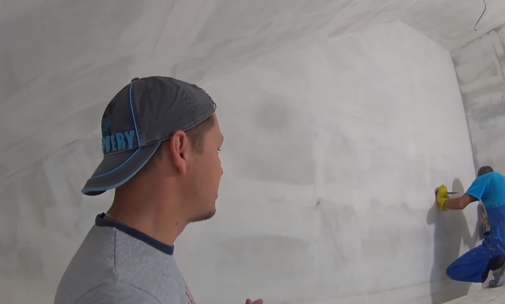 Состав наносится в 2 слоя, при этом на первом этапе уделять особое внимание небольшим дефектам не стоит. При обработке основания мелкой сеткой или шкуркой нужно затирать неровности