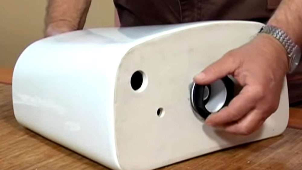 Вода подается сверху и снизу емкости по гибкому шлангу. Одна часть вставляется в выходное отверстие бака, а другая часть — в водопровод.