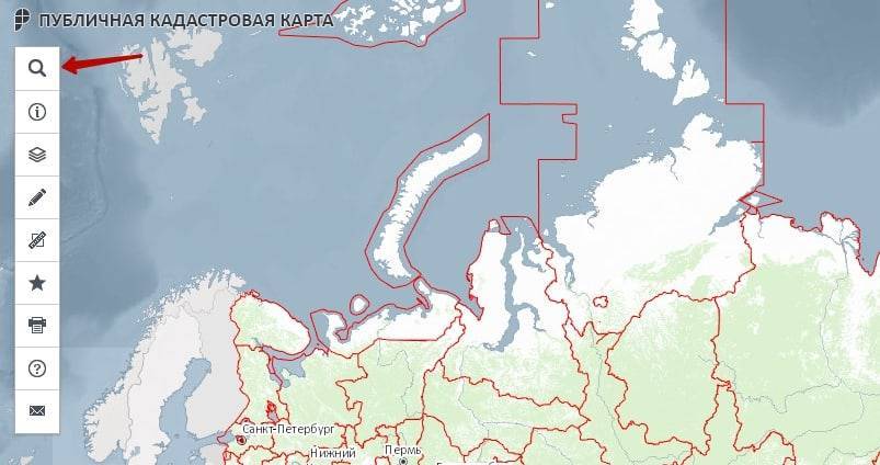 1. Перейти на содержащий онлайн кадастровую карту сайт: http://pkk5.rosreestr.ru нажать на кнопку в левом верхнем углу, изображающем лупу.