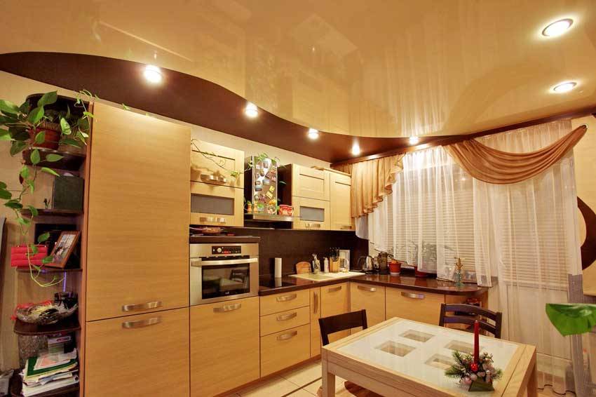 Многоуровневые глянцевые натяжные потолки в интерьере кухни классического стиля