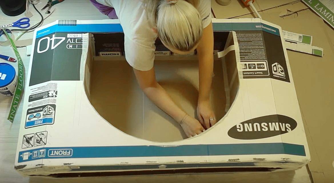 Главное соотнести размеры коробки и места, куда вы хотите установить свой самодельный камин. После чего следует разрезать картон, чтобы получить заданную форму. Закрепить форму нам поможет скотч.