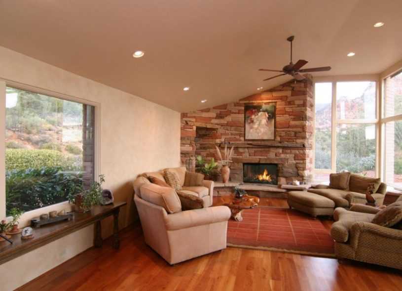 Как говорилось выше, камин – центральный смысл комнату и важно правильно выбрать место его установки. Для создания гармоничного дизайна лучше всего повернуть камин к центру комнаты так, чтобы огонь было видно откуда угодно