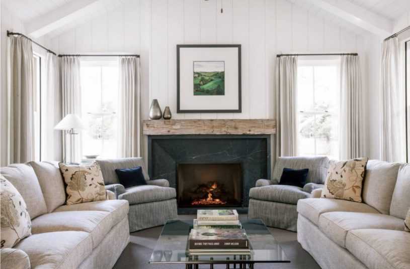 Одно из лучших решений – размещение на смежных сторонах, когда расположенный сбоку от дивана камин будет дарить тепло, при этом не отвлекая от просмотра телевизора