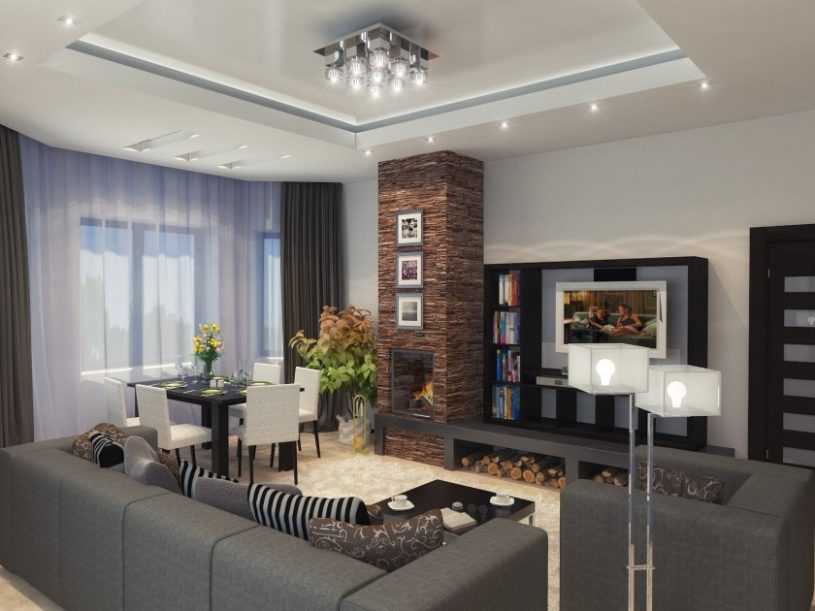 В просторной комнате камин и телевизор лучше разместить в разных местах, чтобы каждый предмет формировал свою собственную зону