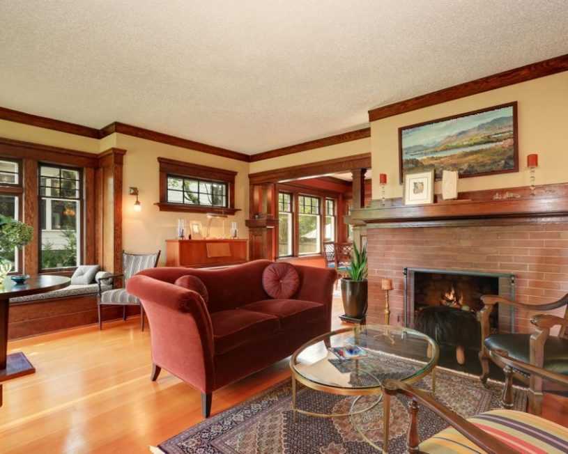 Отделка выполнена из благородного материала, чаще это хорошее дерево. Все украшено резьбой, скульптурами. Каждый элемент выдержан и отдает «стариной». Около такого камина обязательно должны быть старинные картины или хорошие репродукции.