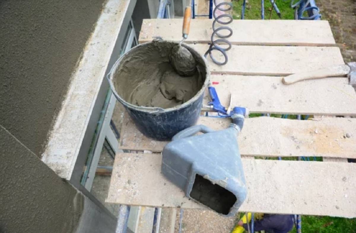 Густота состава в работе картушным устройством не отличается от состава при ручной штукатурке. Она должна сползать вниз по воронке как густая сметана. На ствол надевается широкая форсунка, если мастер работает с густым цементом. При более жидкой консистенции выбирают узкий наконечник. Раствор добавляют в воронку. Для покрытия 1,5 кв.м поверхности слоем в 1см потребуется 25 кг.