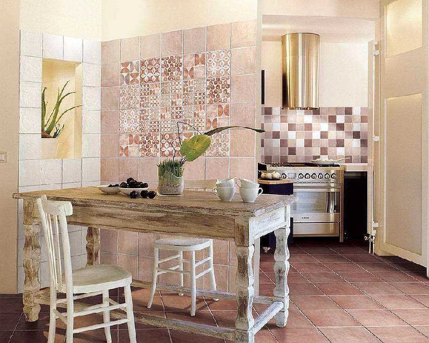 - не нужно подбирать для разных поверхностей одинаковую форму плиточек – на полу можно выложить керамический паркет или прямоугольных плашек, а на стенах может быть фартук из квадратных плиток;