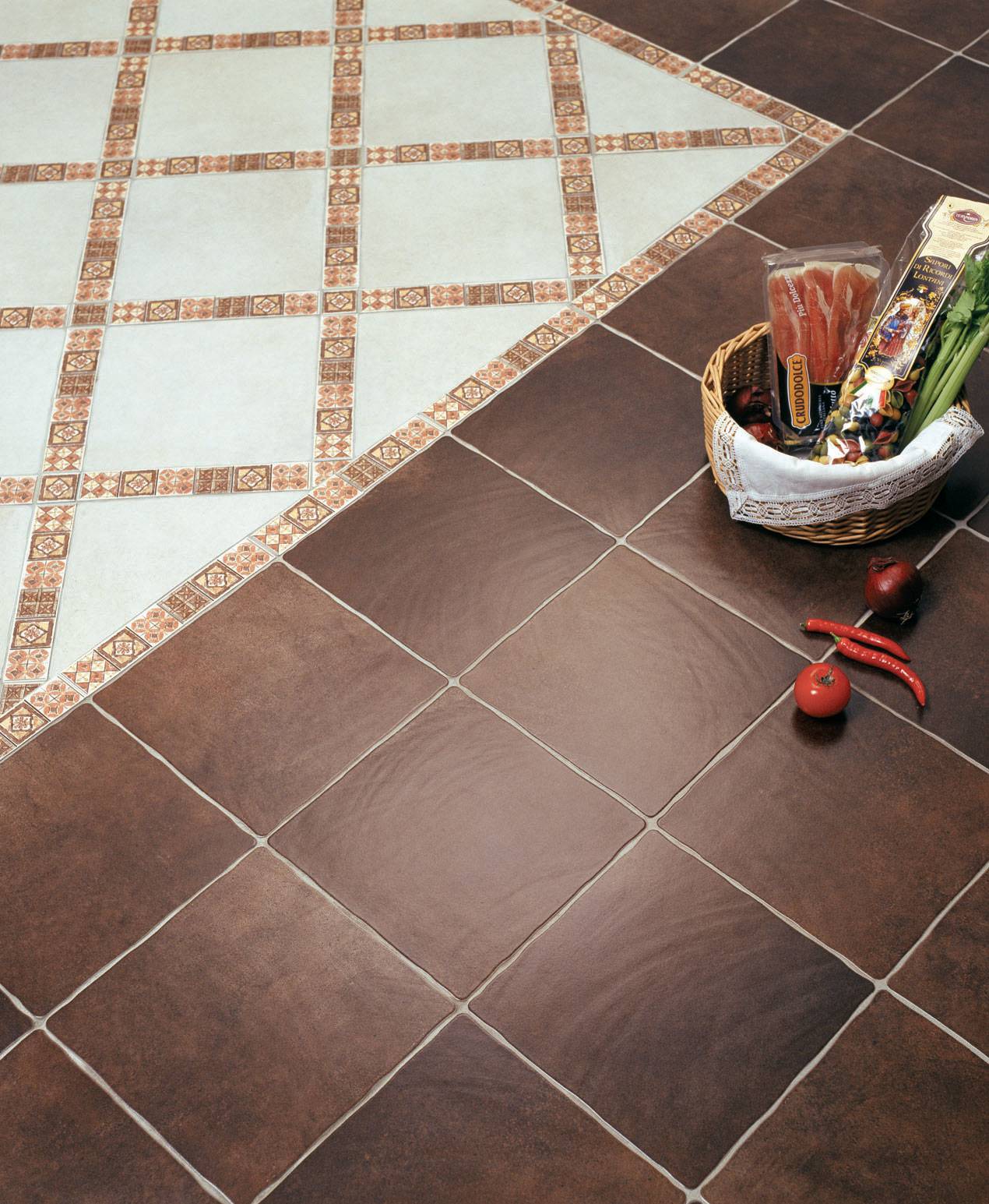 Темная плитка подойдет только для больших помещений. Разнообразить монотонный пол призваны вставки из другой плитки, контрастной по оттенку к основной
