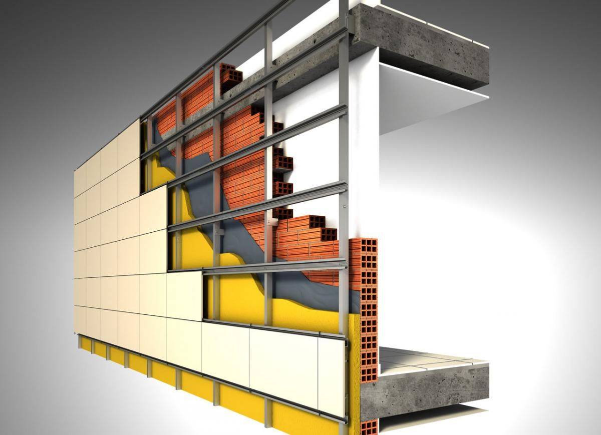 Устройство навесных конструкций можно выполнить самостоятельно. Преимущество данного способа заключается в том, что осуществляется дополнительное утепление здания. Такая конструкция состоит из каркаса, который закрепляют на стенах дома, утеплителя и плит керамогранита.