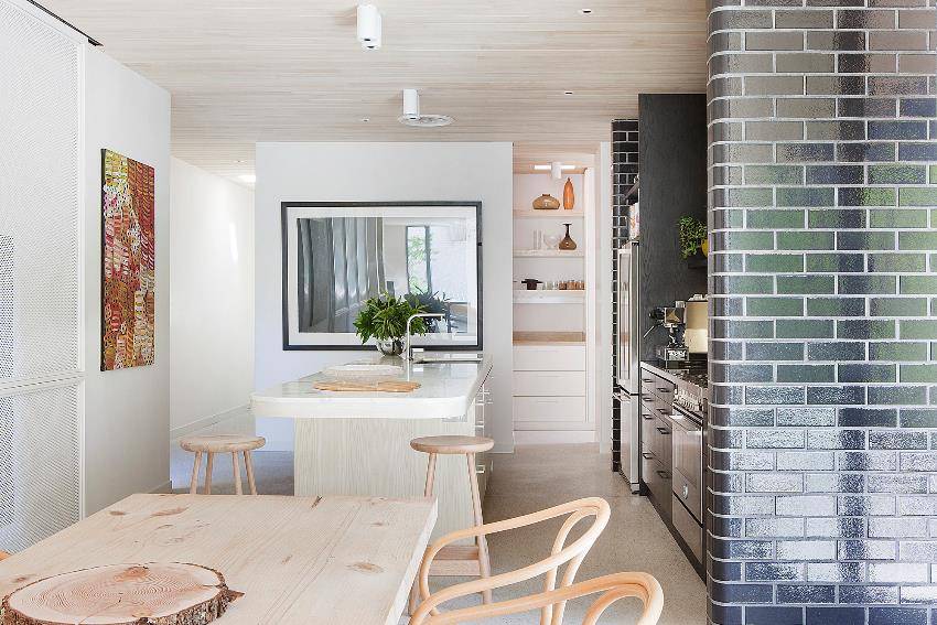 На кухне стена из кирпича наиболее уместна в зоне кухонного фартука. Там постоянно что-то режут, варят, там брызжет жир, соки и другие жидкости, которые могут оставить пятна. Кирпичу это все не страшно: его легко вымыть, если возникнет такая необходимость.