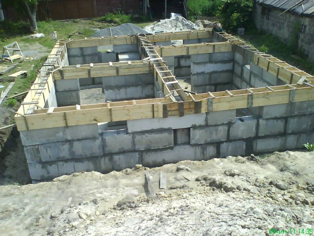 Межэтажный пояс лучше всего изготавливать с каркасом из 4-х 12 миллиметровых арматур высотой примерно 40 см. Данный слой укладывается по периметру всех несущих стен. Если толщина стен меньше 500 мм, то в качестве опалубки можно использовать кирпичную кладку, если больше, то необходима деревянная опалубка, монтируемая обычным способом.