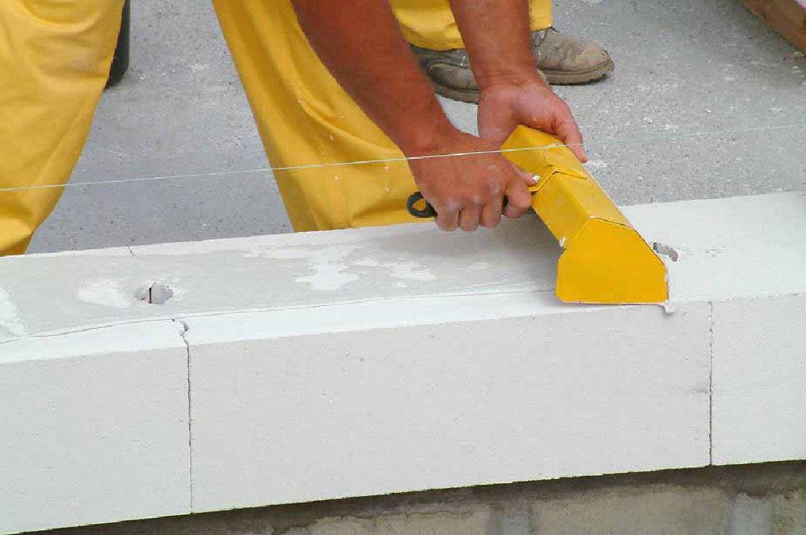Газобетонные блоки требуют предварительной подготовки – очищения от пыли и грязи с помощью щетки. Первый ряд выкладывают на бетонный раствор, соединяя блоки между собой с помощью клея. Их укладывают на одном уровне, избегая перепадов высот. Для регулирования высоты укладки используют резиновую киянку. Подгонку материала выполняют с помощью специальной ножовки.