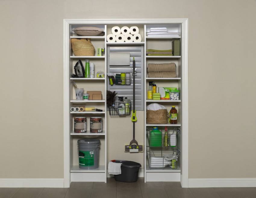 Наполнение может зависеть от того, к какой комнате она примыкает. Например, небольшая кладовка на кухне скорее всего станет хранилищем для соответствующей утвари, домашней консервации, в спальне – превратится в своеобразную гардеробную для хранения одежды. Расположенная в прихожей, рядом с входной дверью – станет отличным местом для складирования сезонных вещей, спортивного инвентаря, пылесоса, бытовой химии. Швабры и кухонные полотенца практичнее помещать в подвешенном состоянии, для чего можно обустроить специальные крючки-кронштейны.