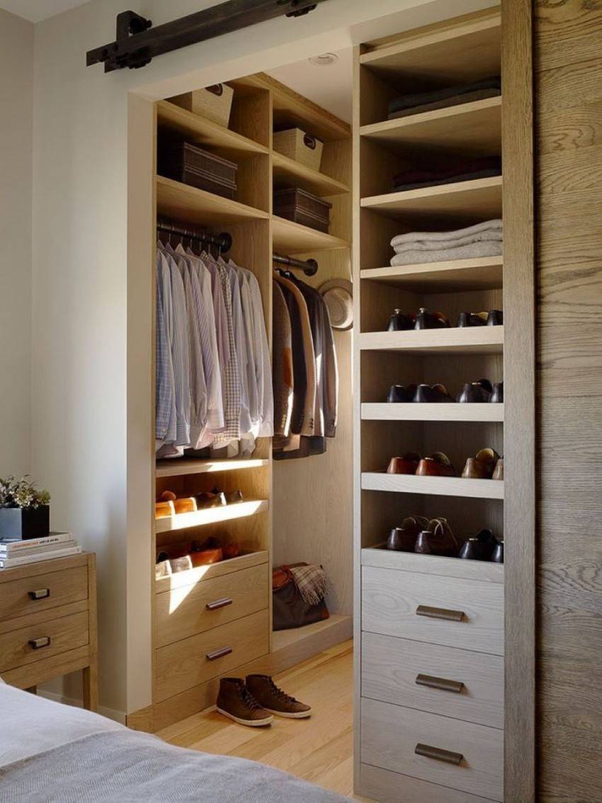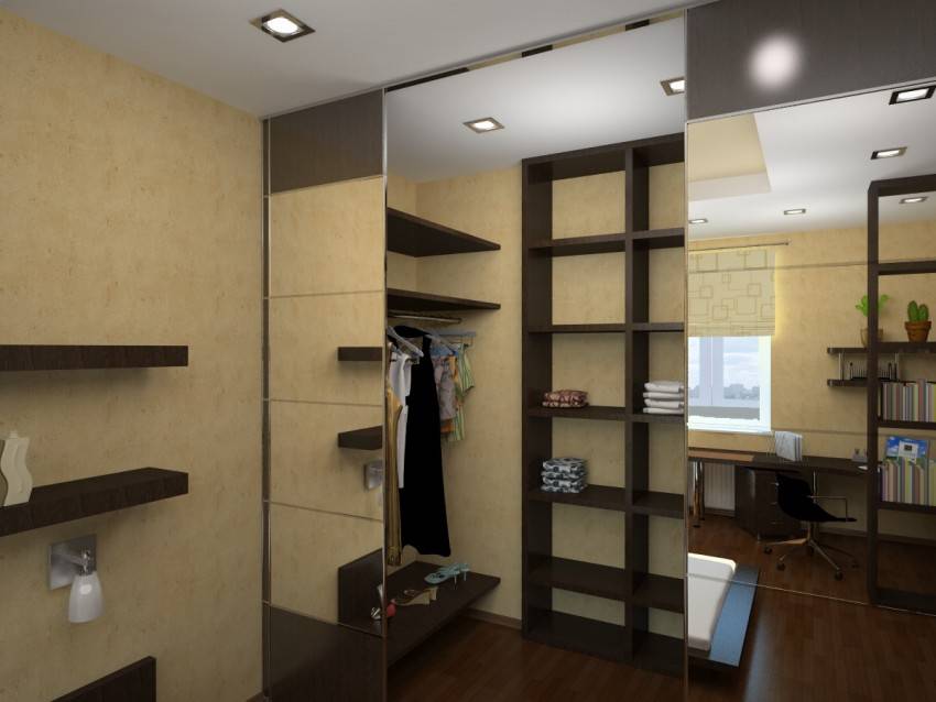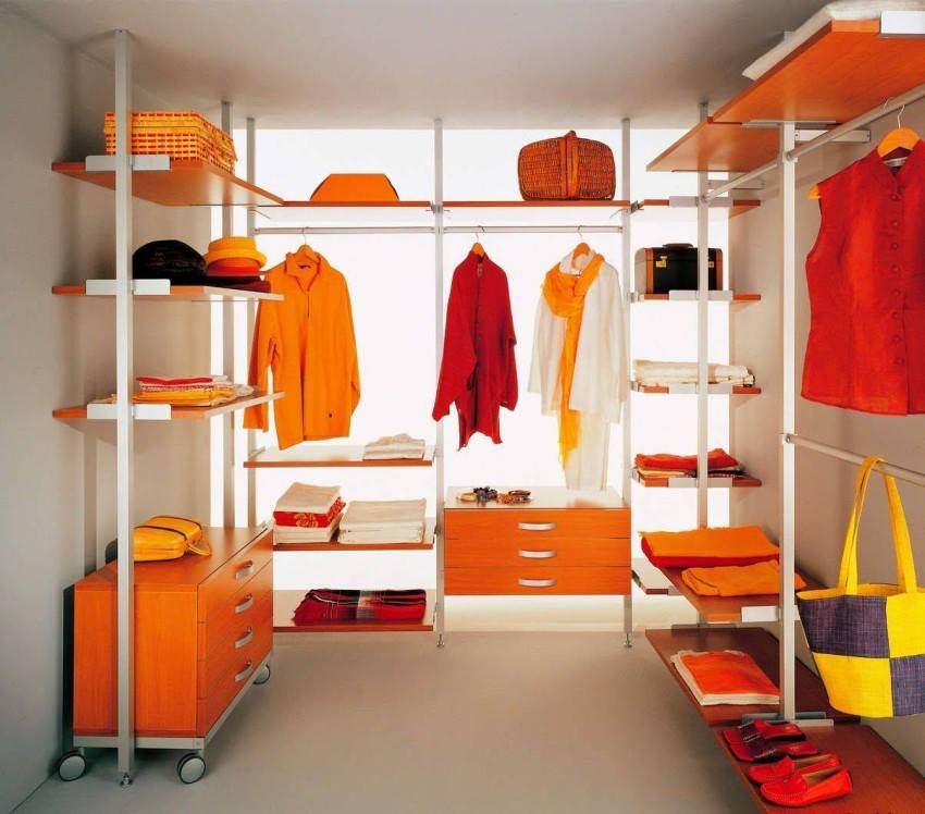 - кладовка-гардеробная станет отличным решением в спальне или гостиной. Ее необходимо снабдить не только полками разной высоты, но и массой выдвижных ящиков, штангами и крючками;