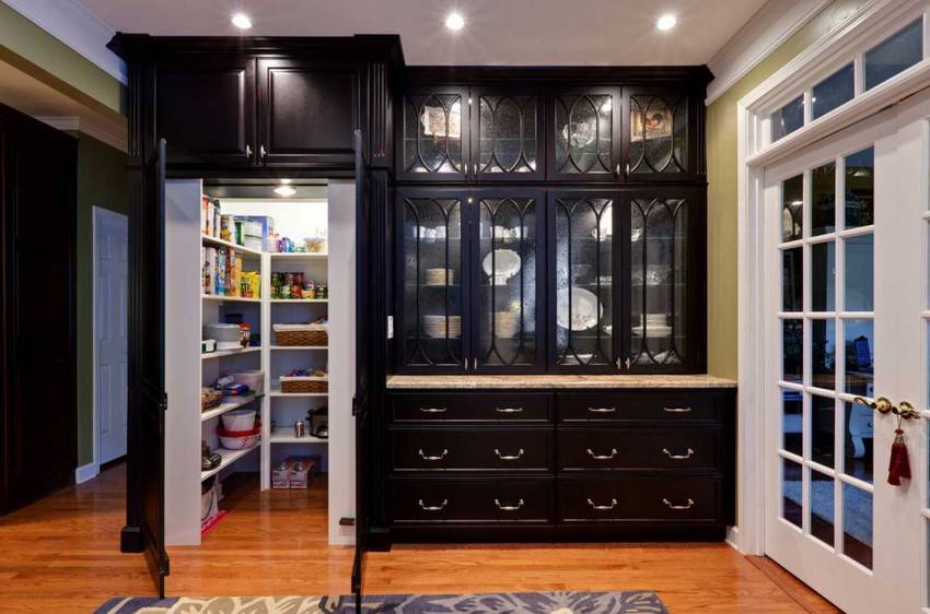 Внутри, кухонное хранилище оборудуют полками, на которые расставляют посуду, продукты и компактную бытовую технику в виде тостера, мультиварки, хлебопечки и прочего. Подобное интерьерное решение в квартире, делает кухню более просторной и придает ей интересный облик.
