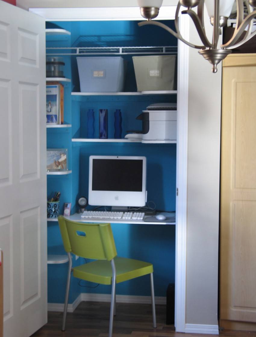 - кладовка-офис – вариант, конечно, не для всех, но также имеет место быть. Площадь помещения должна быть достаточной для размещения небольшого стола и стула, пространство под потолком используют для хранения. Уместной тут будет магнитная доска. В рабочем помещении без окон организация освещения требует особого внимания.