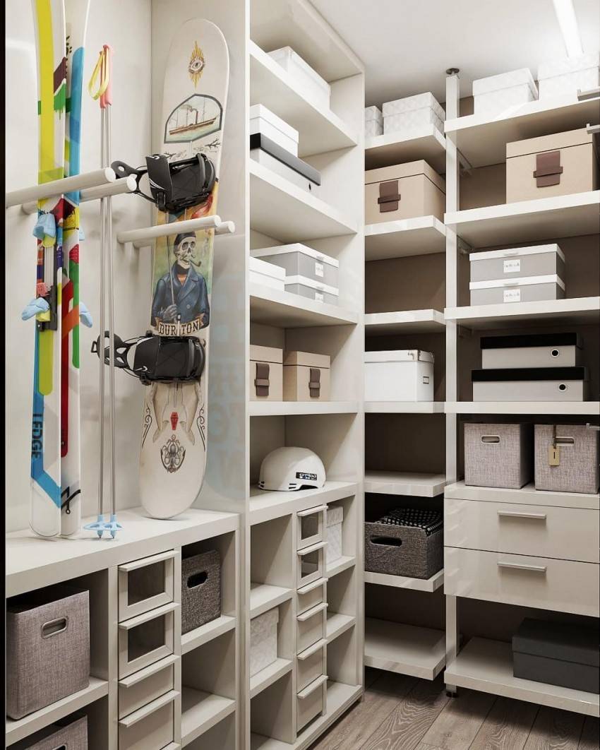 Отметим, что обычно кладовка играет роль универсального хранилища: тут складывают все, от утюга до лыж, но если есть необходимость, то пространство кладовки можно обустроить совершенно иначе: