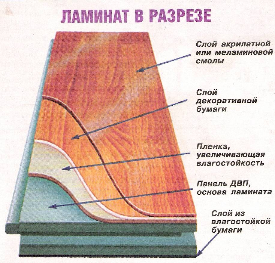 Традиционно доска ламината представляет собой конструкцию из четырех слоев, при этом каждый производитель может сочетать различные материалы для достижения конкурентных преимуществ. От технологии соединения каждого слоя, а также использованного в производстве сырья зависит прочность, гибкость, устойчивость к воздействию внешних факторов окружающей среды и прочие характеристики.