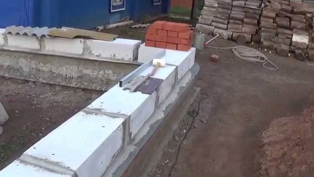Сначала начинаем закладывать блоки во всех углах дома. Прослойка цементного раствора должна быть около двух сантиметров. Первый блок закладываем в самом высоком углу дома. Находим его с помощью специального инструмента для нивелирования. Но всё равно разница по высоте не должна быть больше трёх сантиметров.