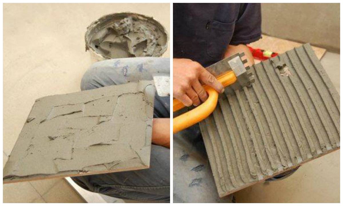 Для нанесения клея применяют зубчатый шпатель или терку с квадратными зубцами. Мастерком набирают клей, кладут на основание, разравнивают шпателем. Прижимают плитку как можно сильнее, повторяют работу далее, не забывая про межплиточные швы. Укладка кафеля встык не допускается. При монтаже крупноформатных объектов, камня, при фасадных работах клей наносят на поверхность каждой плитки и на основание. Толщина клеевого шва составляет от 3 мм, она зависит от сложности работы и размера плитки.