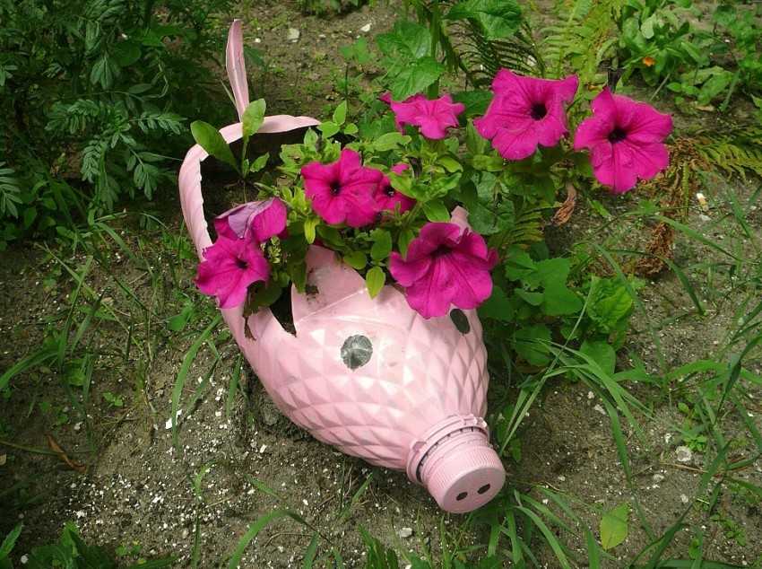 Этот вид клумбы очень просто сделать своими руками. Она отличается простотой организации и потрясающим внешним видом, который еще не успел приесться. Идея заключается в том, чтобы создать иллюзию того, что из опрокинутого на землю сосуда вытекает жидкость, в роли которой будут выступать цветы.