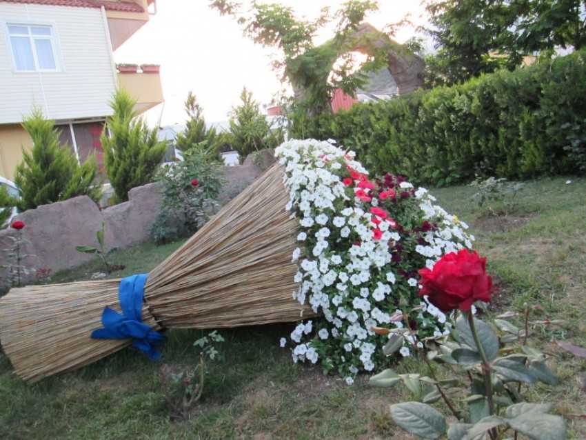 Подойти к созданию клумбы можно с большей фантазии, украсив ее подручными материалами. Часто бывает такое, что где-то в гараже или в сарае лежат неиспользуемые вещи, которые можно использовать для обустройства цветника.