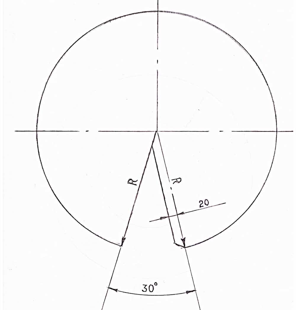 - Заготовку обрезают ножницами, после чего рисуют сектор, длина дуги которого равна 120 мм. Полученная фигура чем-то напоминает кусок торта.