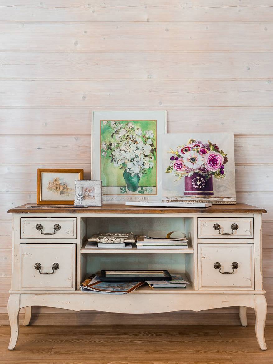 прованс – белый комод в таком стиле легко вписывается в старинный интерьер. Его фасад намерено состаривают (его украшают царапины и потертости).