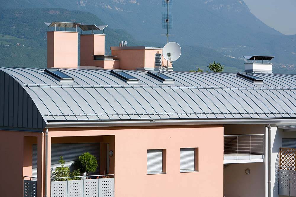 Использование металлических рулонных материалов при монтаже фальцевых кровель позволяет добиться минимального угла наклона ската без сложных дополнительных конструктивных решений. Так, минимальный рекомендуемый уклон для фальцевой крыши – всего лишь 7º. Однако, если в процессе монтажа использовать уплотнитель для стоячего фальца или специальный герметик Рунотекс, то на небольших участках (например полукруглые участки кровли) минимально возможный уклон может снижается до 3º, что практически соответствует плоским кровлям. Но материалы для плоских кровель эта тема уже другой статьи. При использовании металлических листов для монтажа фальца и на скатах большой длины рекомендованные углы возрастают, т.к. горизонтальные стыки являются потенциальным местом протечки. Для улучшения герметичности горизонтальные замки также должны монтироваться с использованием уплотнителя. Существует четыре основных вида фальцевания: Г-образный фальц, реечный фальц, одинарный стоячий фальц и двойной стоячий фальц. Для кровель с малым уклоном подходят двойной стоячий и реечный фальцы. Г-образный фальц и одинарный фальц не используется при углах наклона кровли менее 25º.