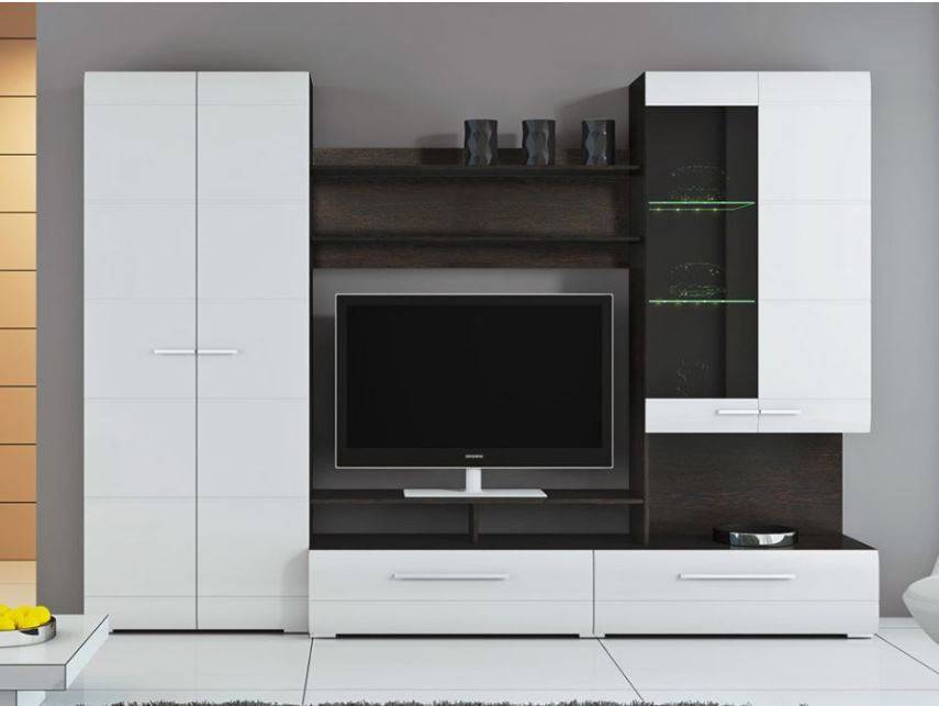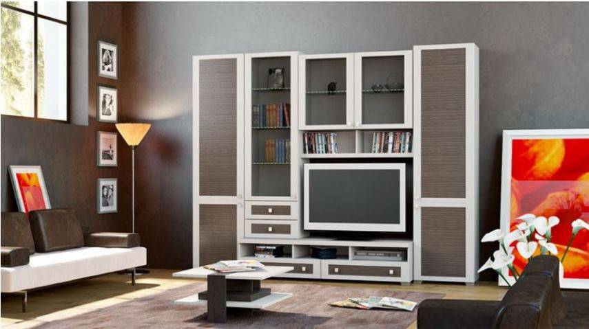 Компоненты стенки в гостиную это обычно: шкафы, полки, тумбы и навесные шкафчики