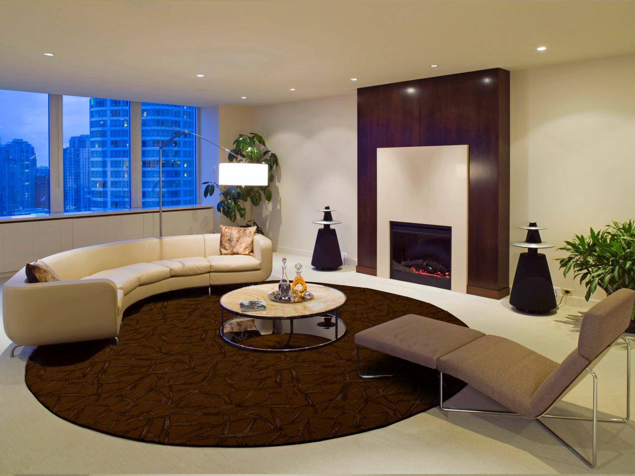 часто на ковре размещают всю мягкую группу вместе с журнальным столиком. Такой вариант используется в квартирах-студиях и совмещенных с кухнями гостиных. Таким образом выделяется зона отдыха, а все ее атрибуты объединяются воедино. Размер ковра при этом достаточно большой и зависит от параметров и количества предметов мягкой мебели;
