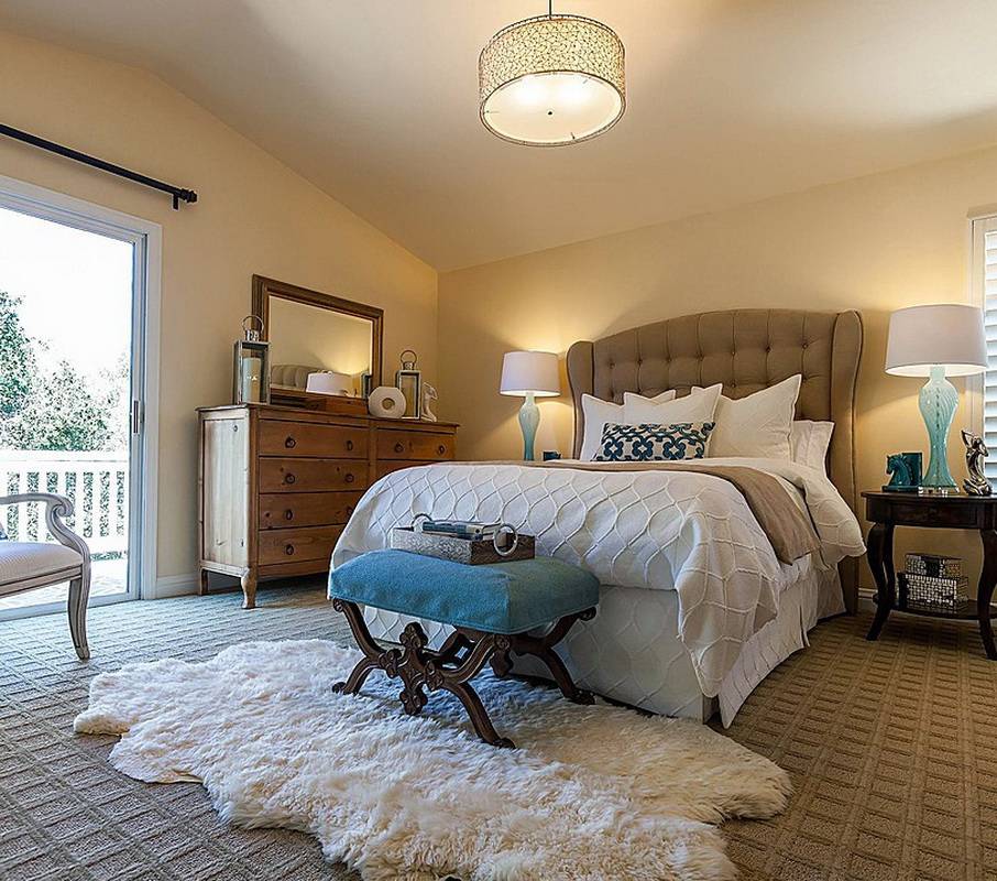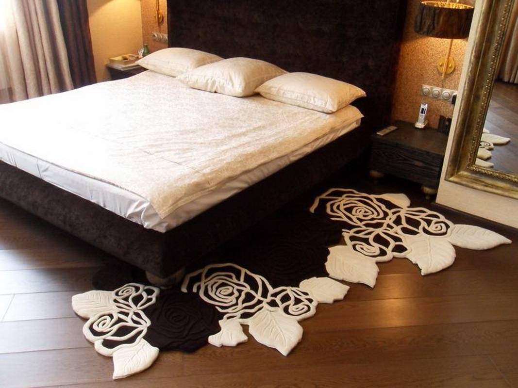 Очень стильным и необычным является прикроватной коврик в виде шкуры животного. Это может быть как натуральная шкура, так и её искусственный аналог. Таким образом можно оживить интерьер спальни и сделать его более шикарным. Такое решение прекрасно пройдёт для спальни в стиле Кантри или в классическом. В этом случае спальню обычно украшают и другими деталями со звериным принтом, который повторяет ковёр-шкура. Он может внести комфорт в дом и добавит ощущение роскоши.