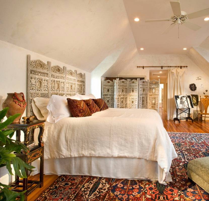 Очень модными и универсальными сейчас являются фактурные прикроватные ковры. Как правило, это изделия, на которых изображены объёмные цветы, а также очень красивый геометрический принт. Последний вариант прекрасно подходит для спальни в этническом стиле, он может разнообразить интерьер.