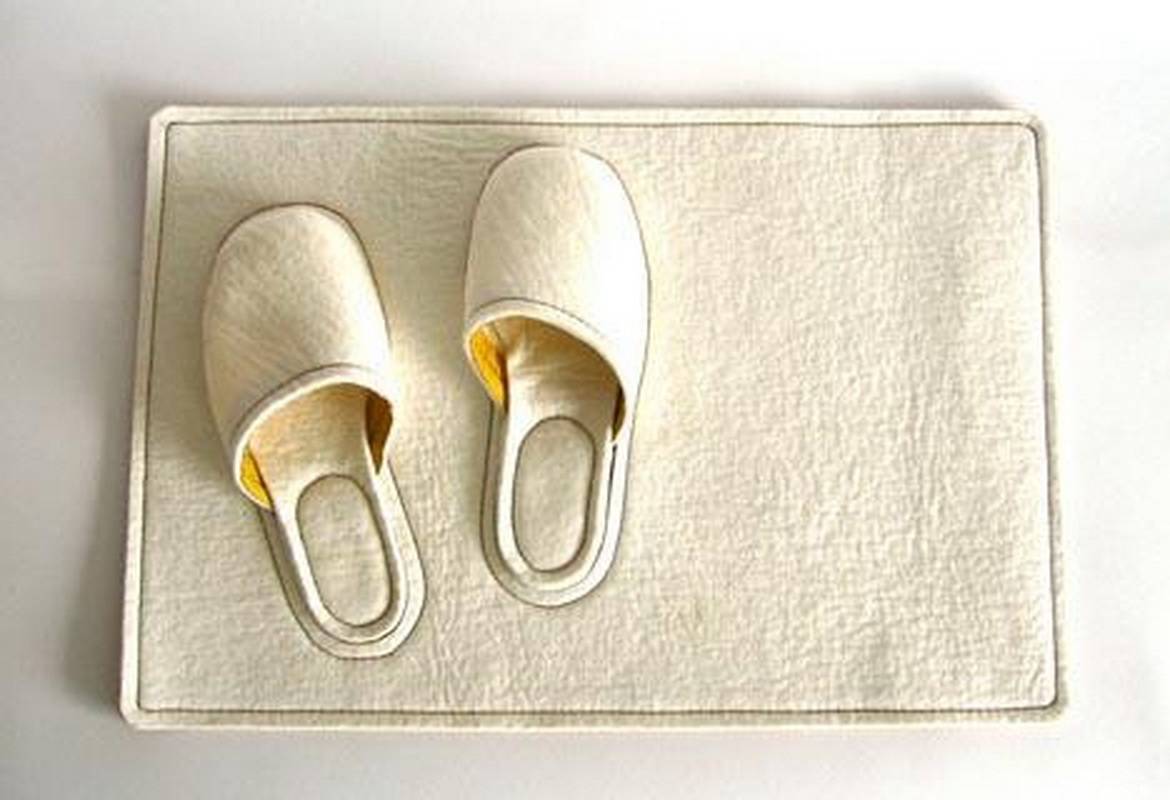 Очень необычное решение – это прикроватный ковёр с домашними тапочками. То есть сам по себе коврик выглядит вполне обычно, но имеет отделение, в которое можно вставить тапочки-сланцы, которые выполнены из того же материала. Они совсем не заметны на фоне ковра. Просыпаясь утром, вы можете встать на коврик и сразу же надеть тапочки, которые будут согревать вас. Это очень необычно и удобно, такое решение способно удивить кого угодно.