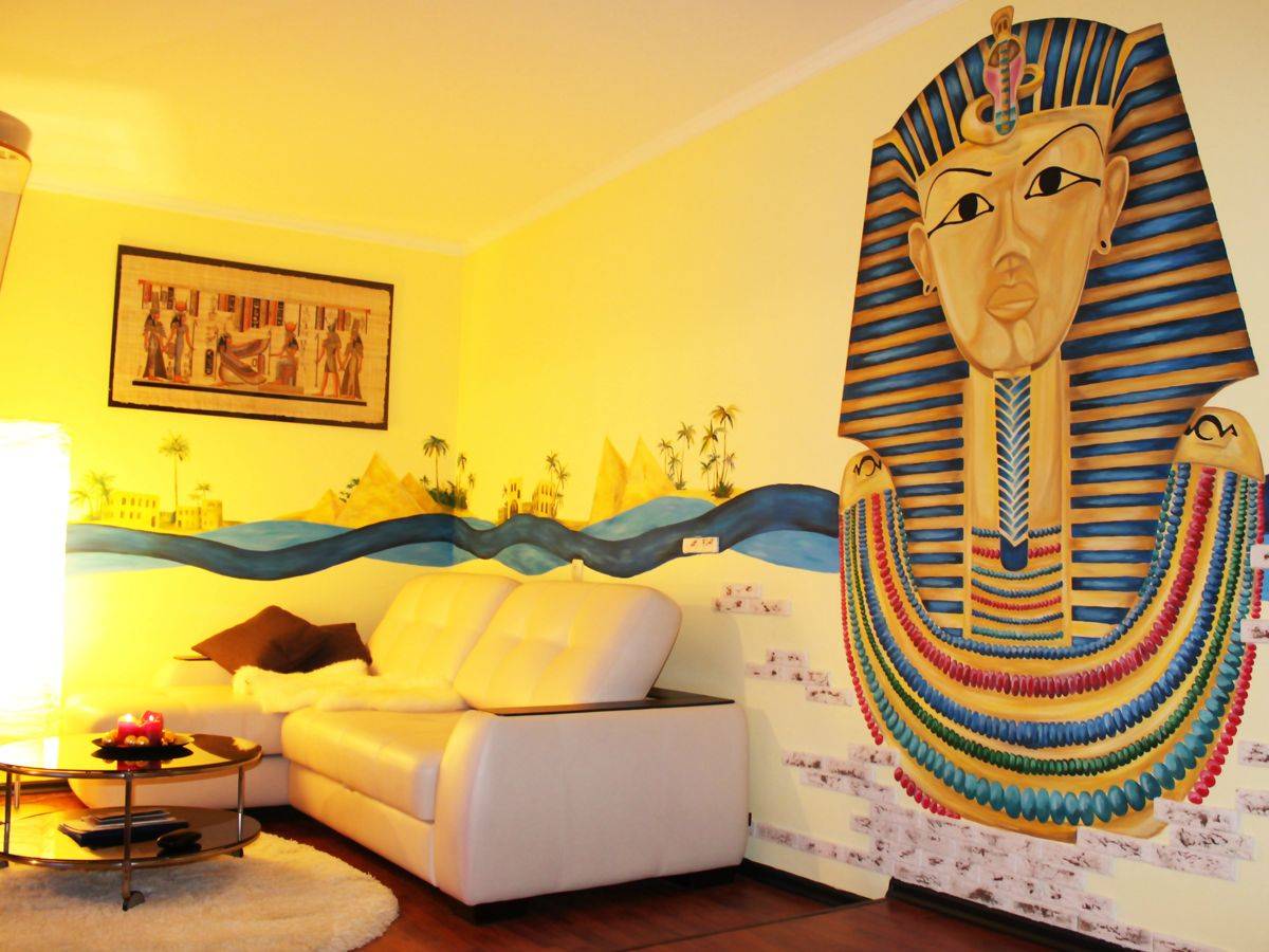 Потолок покрасьте в цвет слоновой кости. Если необходимо создать яркие акценты, используйте для этого текстильный декор — шторы, накидки на кресла и диван. Они могут быть красного или золотистого цвета. На стены повесьте картины с изображением фараонов, египетских женщин. Если гостиная большая, можно разместить здесь колонны. Используйте такую мебель в интерьере — диван с текстильной или кожаной обивкой, комод или сундук, украшенный резьбой, столик и стулья с оригинальными ножками;