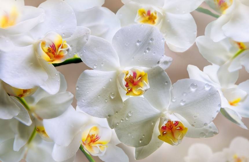 Это чрезвычайно элегантный и чистый цветок, который выделяется в любой цветочной композиции. Белые орхидеи выражают чистоту, невинность, добродетель и божественную красоту. Орхидея считается символом утонченности и гламура, поэтому идеально подходит для свадебных букетов.