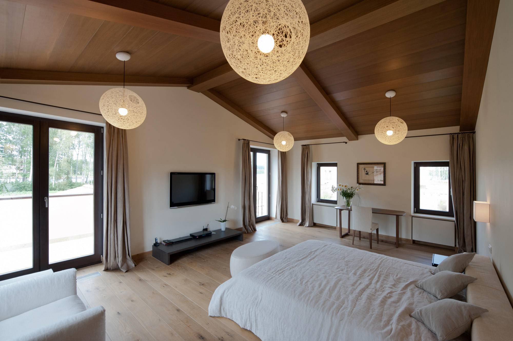 Просторная спальня в частном доме может служить не только местом отдыха, но и зоной для деятельности, увлекающей хозяев коттеджа. Также можно создавать объемные зоны для хранения вещей.