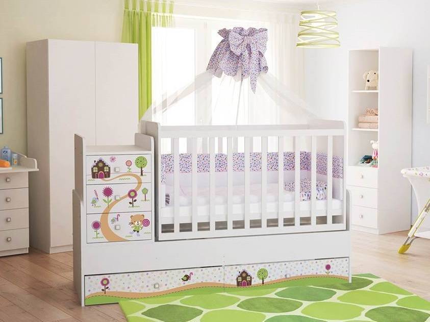 - Кровать – трансформер сделана из натуральной древесины. Такие кроватки для новорожденных сразу идут в комплекте с комодом для белья и пеленальным столиком. Такая кроватка растет вместе с малышом и удлиняется. Некоторые модели способны переоборудоваться в парту. Из недостатков можно назвать высокую стоимость и возможность увеличиваться только в длину. Более взрослому ребенку будет в ней тесно. К тому же не все модели трансформеров имеют откидывающуюся стенку, которая так необходима маме.